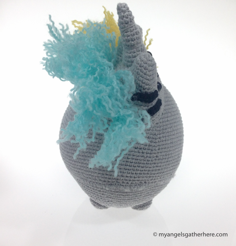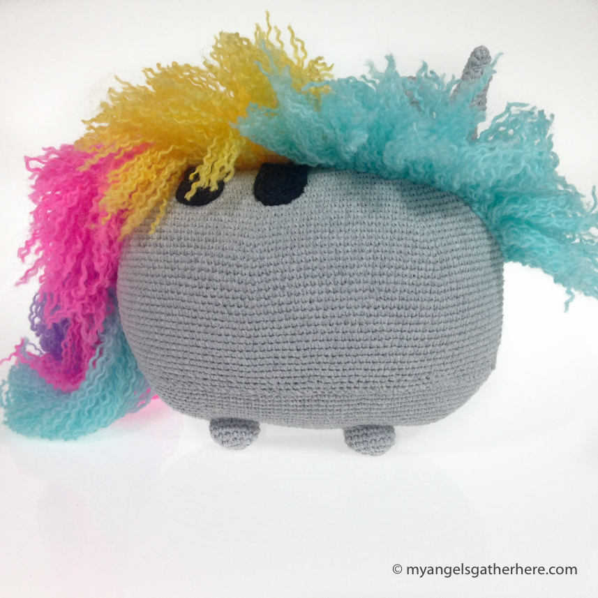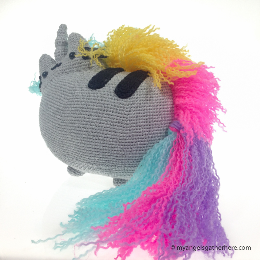 Hand crocheted Unicorn Pusheen plush toy explains itself why Pusheen is a colorful figure. Fun fact: Pusheen loves ham less than ice cream, but we’re not sure what unicorns prefer.